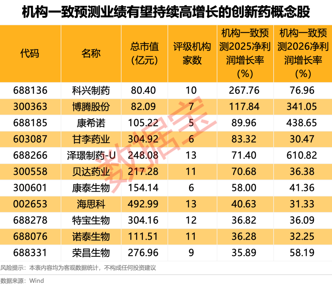 业绩预期方面,获得5家及以上机构给予评级的概念股中,有11股2025年和2026年业绩有望连续超30%增长。