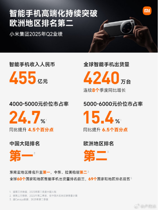 智能手机收入455亿元,全球智能手机出货量4240万台,连续8个季度同比增长。