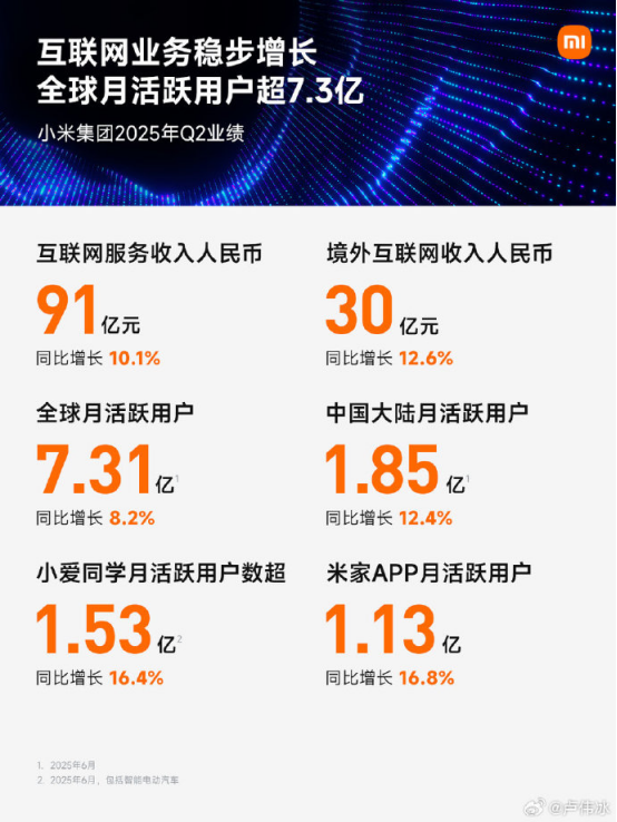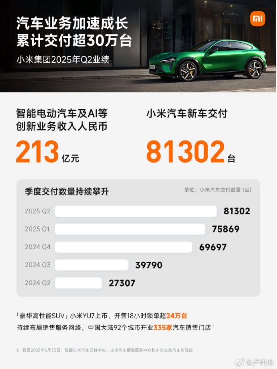 智能电动汽车及AI等创新业务收入213亿元,步入规模化增长快车道。小米汽车加速成长,新车交付81302台,截至7月累计交付已突破30万辆。