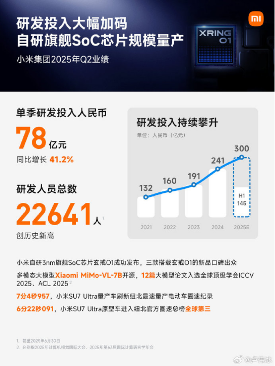 该季度,小米研发投入78亿元,同比增长41.2%,预计今年投入300亿元。研发人员总数22641人,创历史新高。