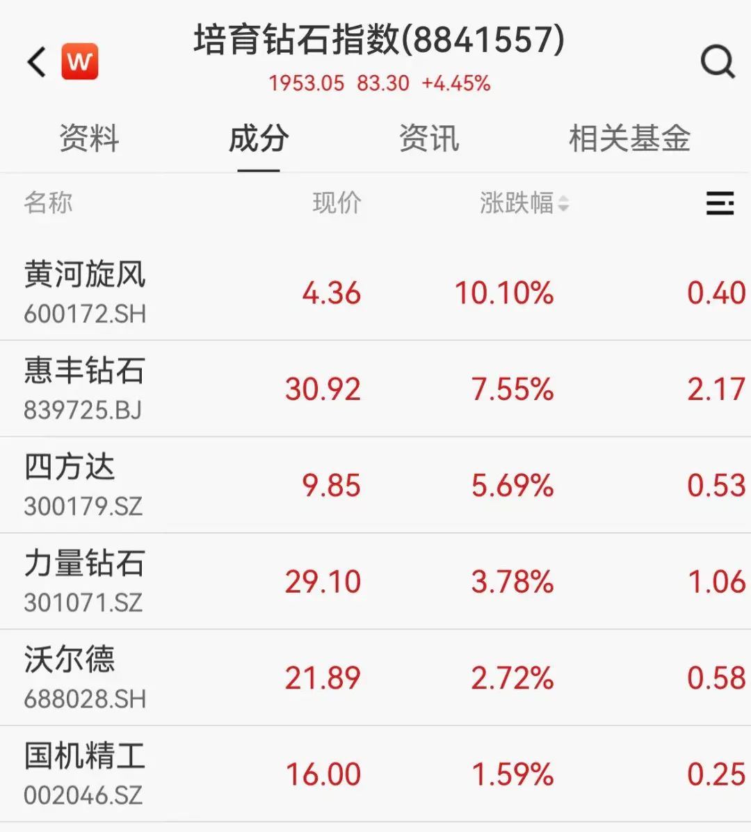 概念板块方面,培育钻石概念股大涨,黄河旋风涨停,惠丰钻石一度涨逾13%,四方达、力量钻石等跟涨。